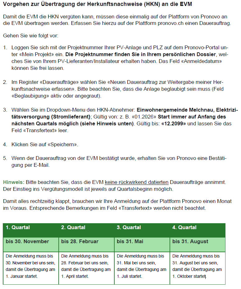 Ihre Photovoltaikanlage leistet einen wertvollen Beitrag für unsere Umwelt. Ab dem 1. Januar 2026 möchten wir diesen Beitrag zusätzlich belohnen: Die Elektrizitätsversorgung Melchnau (EVM) ver-gütet Ihnen neu die Herkunftsnachweise (HKN) Ihres Sonnenstroms.
